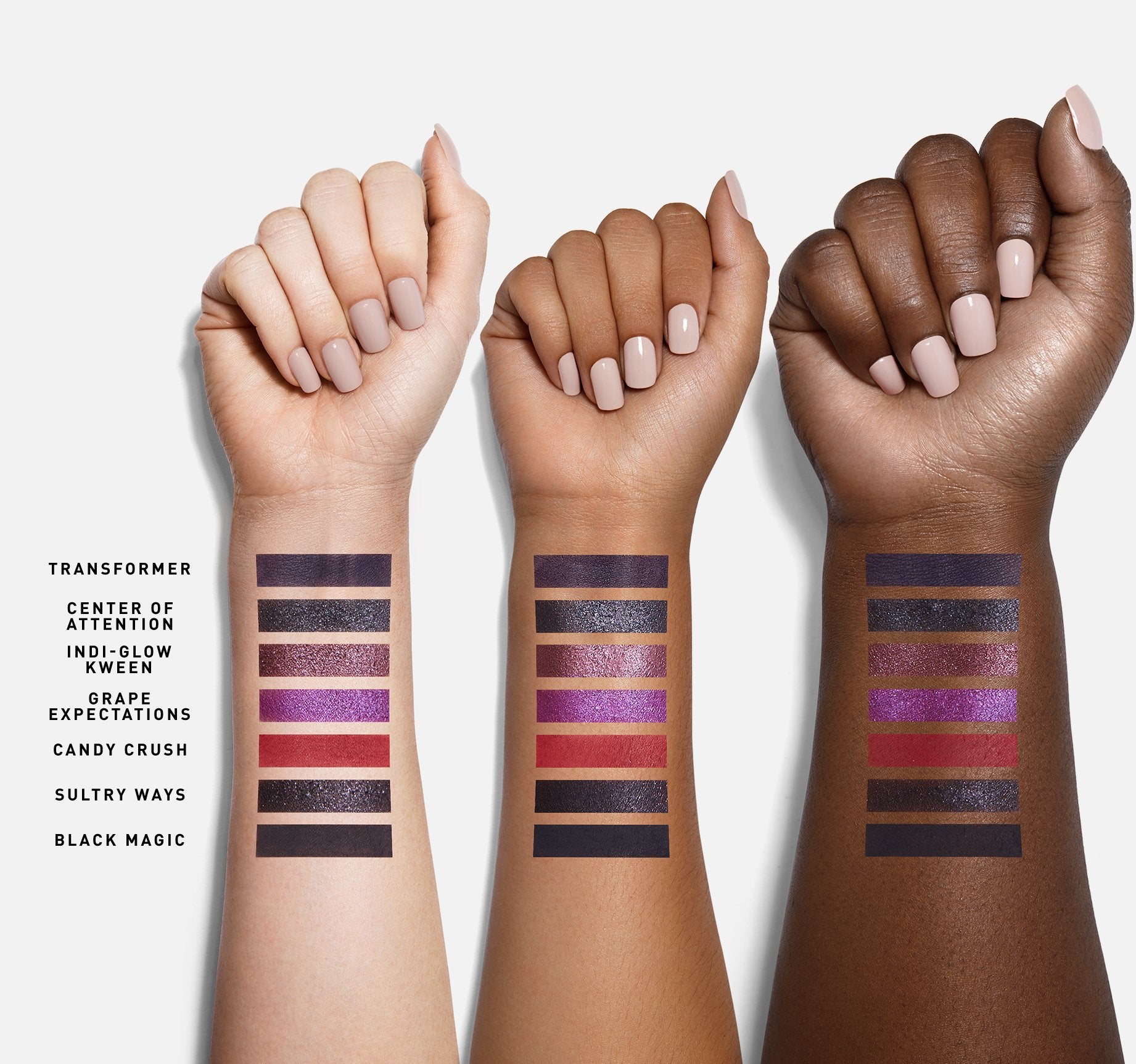 (Eyeshadow: Light Of The Party/Popstar/Stroke Of Luck/Express Yo’self/Nude Tude/Green With Envy/ Sheen Stealer/Stand Out/Bold Moves/Electric Energy/Hello Sunshine/Play It Cool/Hawt Stuff/Peachy Keen/Fired Up/Bright Eyes/Bossy Af/Talk Dirty/Hot To Trot/Sparks Fly/ Confidence/Daredevil/Color Persona/Center Of Attention/Indi-Glow Kween/ Grape Expectations/ Sultry Ways/ Black Magic) Mica, Talc, Synthetic Fluorphlogopite, Dimethicone, Calcium Aluminum Borosilicate, Phenyl Trimethicone, Magnesium Stearate, Octyldodecyl Stearoyl Stearate, Polymethylsilsesquioxane, Silica, Calcium Sodium Borosilicate, Tridecyl Trimellitate, Ethylhexyl Palmitate, Tin Oxide, Ethylhexylglycerin, Phenoxyethanol, Caprylyl Glycol +/- May Contain/Peut Contenir: Titanium Dioxide (CI 77891), Iron Oxides (CI 77491, CI 77492, CI 77499), Manganese Violet (CI 77742), Carmine (CI 75740), Yellow 5 Lake (CI 19140), Red 40 Lake (CI 16035), Blue 1 Lake (CI 42090).